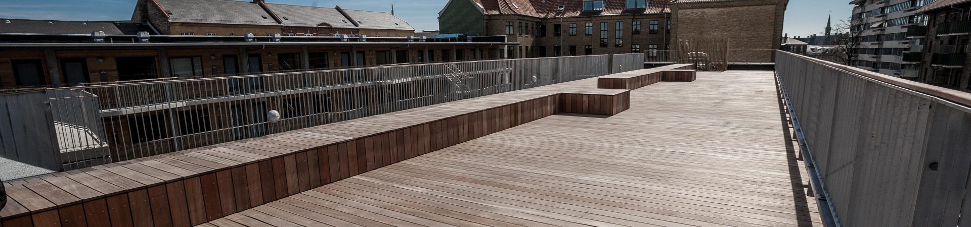Det fælles gårdrum med opholdsareal og bænke, udført med beplantning i plantekummerne og gode befæstede arealer, så færdsel kan ske uhindret – Den fælles tagterrasse er ligeledes et rum for alle aldersgrupper og de bedste rammer for et stærkt og givende fællesskab mellem beboerne.